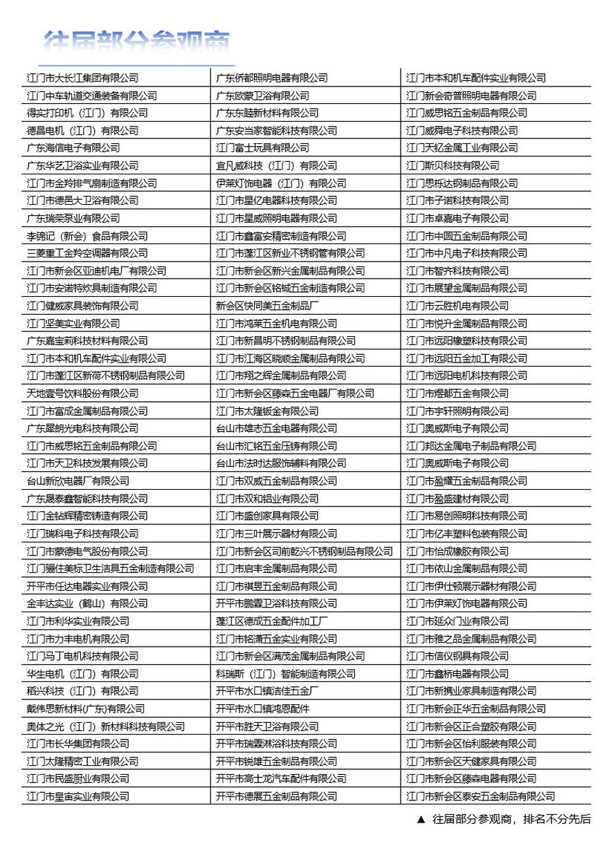 据不完全统计,上一届展会吸引了超1万名专业观众到场,大批特邀买家如约而至,还有众多知名采购商慕名前来参观采购,如:亚迪机电、芝山五金、大洋电机、海信宽带、实力多汽配、富士玩具、中车轨道交通装备、夏朋机车、先丰不锈钢、华佑实业、库力索纳电子、富百力五金、大光明电力设备等多家参观团均到场参观,现场成交额及意向订单金额超1.5亿元人民币,现场采购氛围热烈。